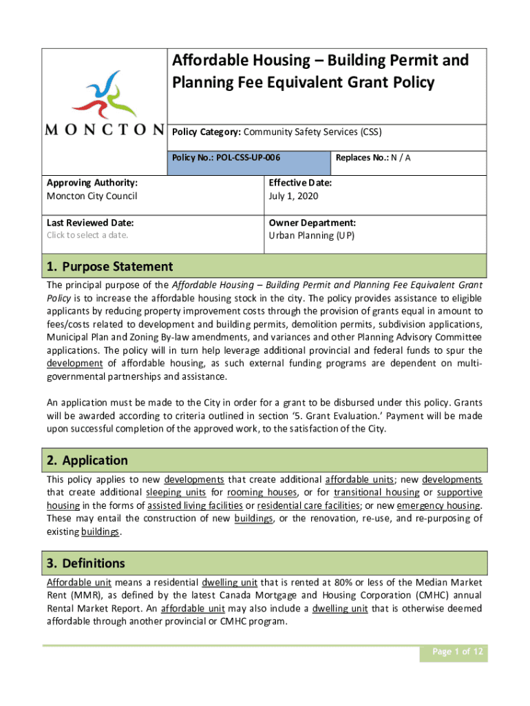 Affordable Housing Building Permit and Planning Fee Equivalent Grant Policy Category: Community Safety Services (CSS) Policy No.: POLCSSUP006Replaces No.: N / Approving Authority: Moncton City CouncilEffective