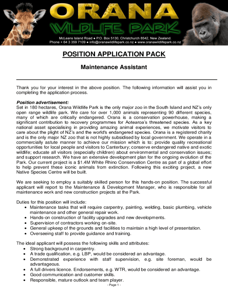 Get the free POSITION APPLICATION PACK - Maintenance Assistant