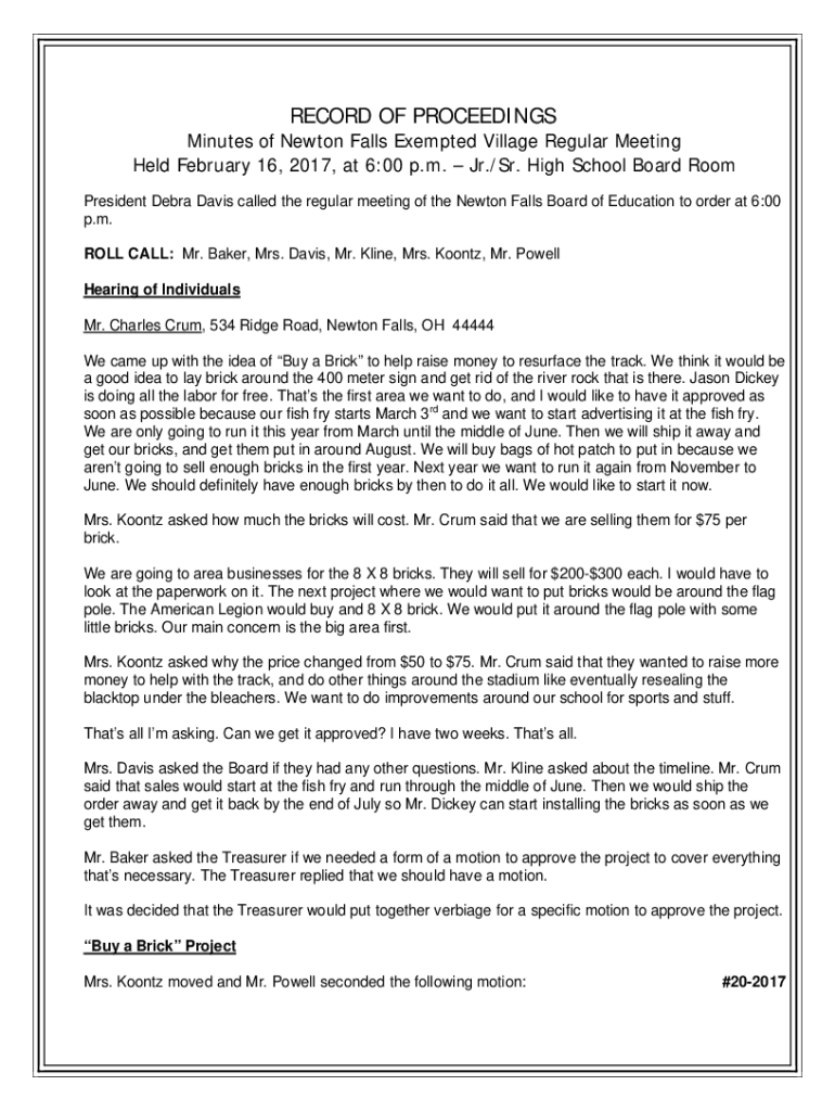 RECORD OF PROCEEDINGSMinutes of Newton Falls Exempted Village Regular Meeting Held February 16, 2017, at 6:00 p.m. Jr./Sr. High School Board Room President Debra Davis called the regular meeting of
