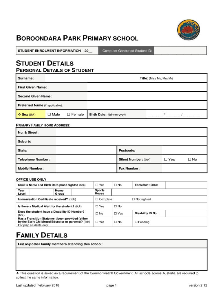 STUDENT Enrollment INFORMATION 20__Computer Generated Student ID:STUDENT DETAILS