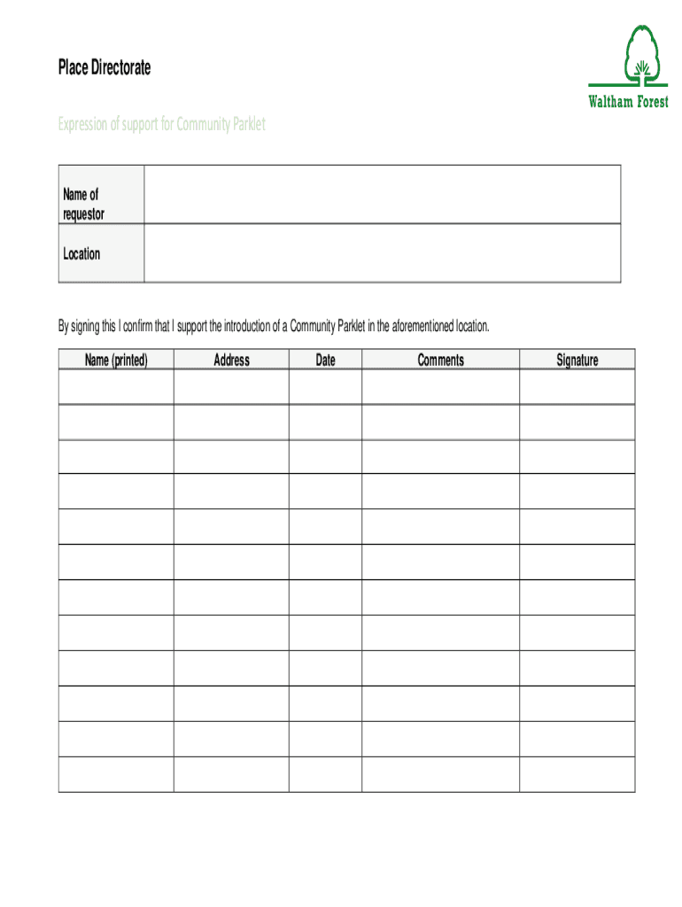 Place Directorate Expression of support for Community Park let Name of requestor Location signing this I confirm that I support the introduction of a Community Park let in the aforementioned location.