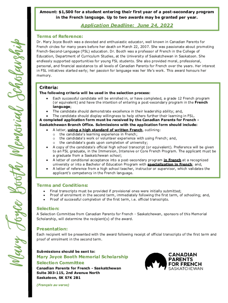 Amount: $1,500 for a student entering their first year of a postsecondary program in the French language. Up to two awards may be granted per year. Application Deadline: June 24, 2022, Terms of Reference: