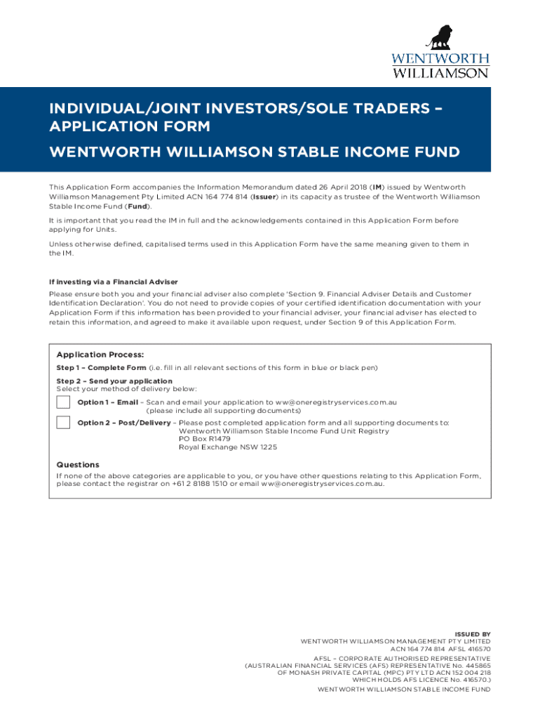 INDIVIDUAL/JOINT INVESTORS/SOLE TRADERS APPLICATION FORM WENTWORTH WILLIAMSON STABLE INCOME FUND This Application Form accompanies the Information Memorandum dated 26 April 2018 (IM) issued by Wentworth