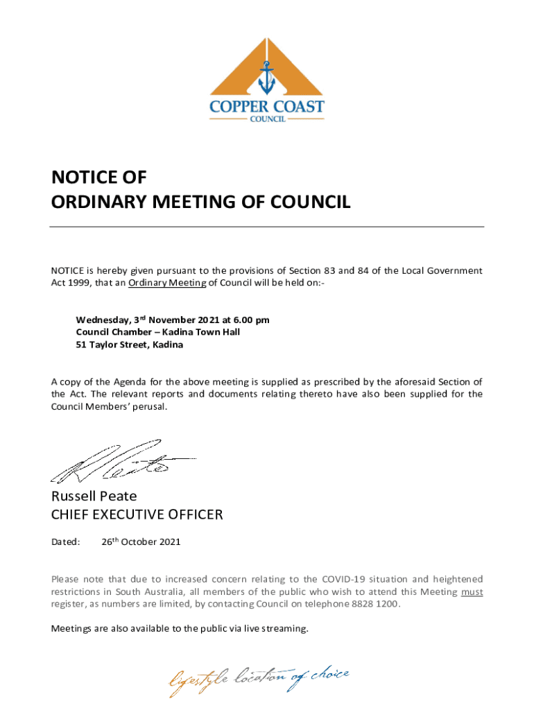 NOTICE OF ORDINARY MEETING OF COUNCILNOTICE is hereby given pursuant to the provisions of Section 83 and 84 of the Local Government Act 1999, that an Ordinary Meeting of Council will be held on:Wednesday,