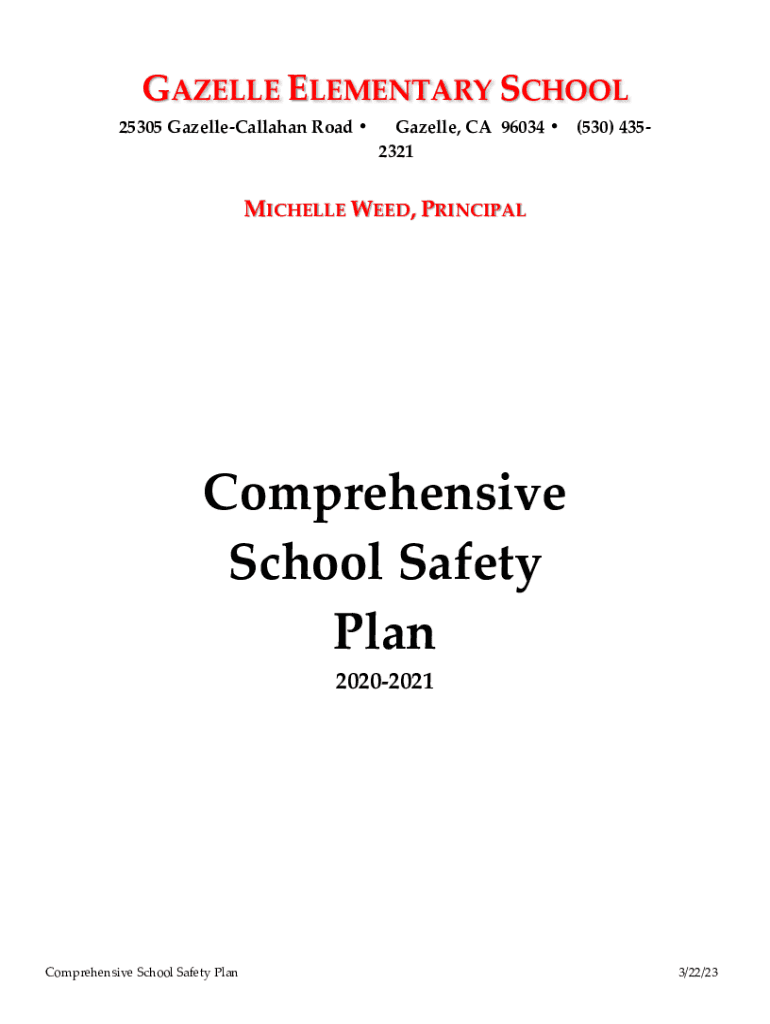 GAZELLE ELEMENTARY SCHOOL 25305 Gazelle Callahan Road Gazelle, CA 96034 (530) 4352321MICHELLE WEED, PRINCIPALComprehensive School Safety Plan 20202021Comprehensive School Safety Plan3/22/23GAZELLE