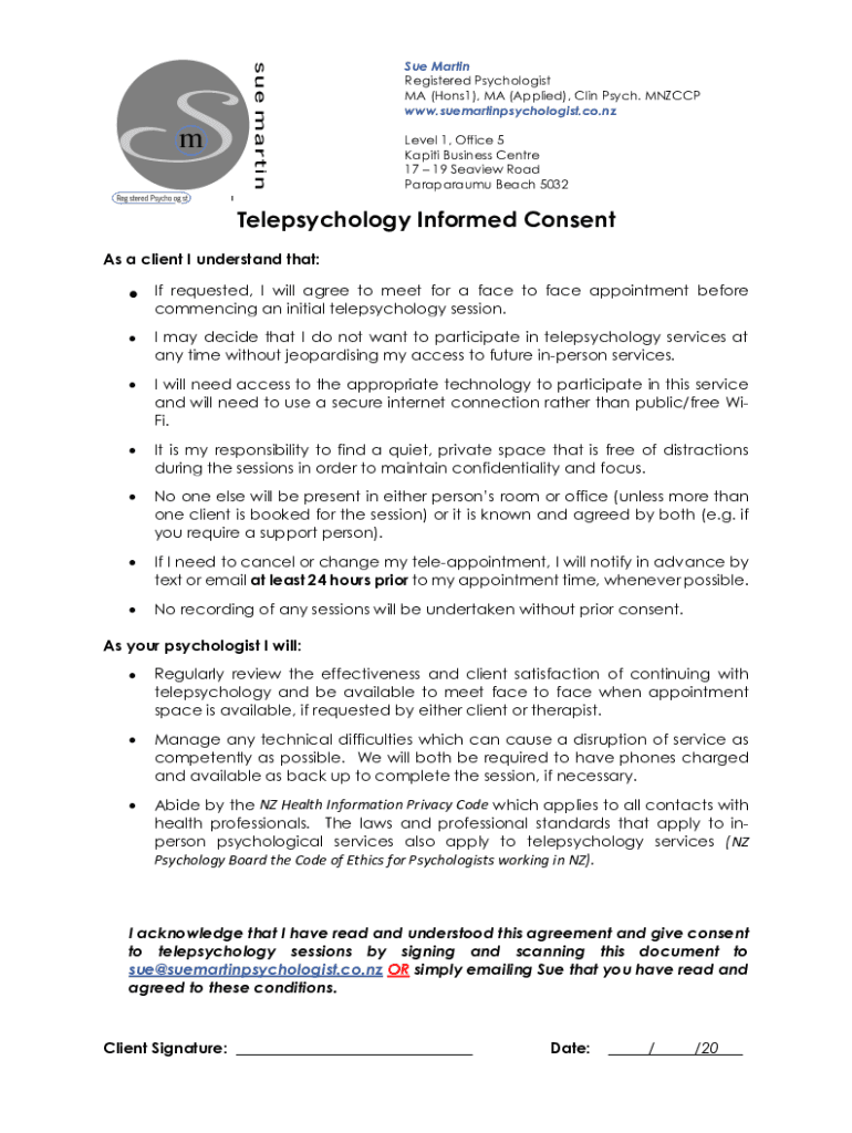 Sue Martin Registered Psychologist MA (Hons1), MA (Applied), Clan Psych. MECCA www.suemartinpsychologist.co.nz Level 1, Office 5 Wapiti Business Center 17 19 Sea view Road Paraparaumu Beach 5032Telepsychology