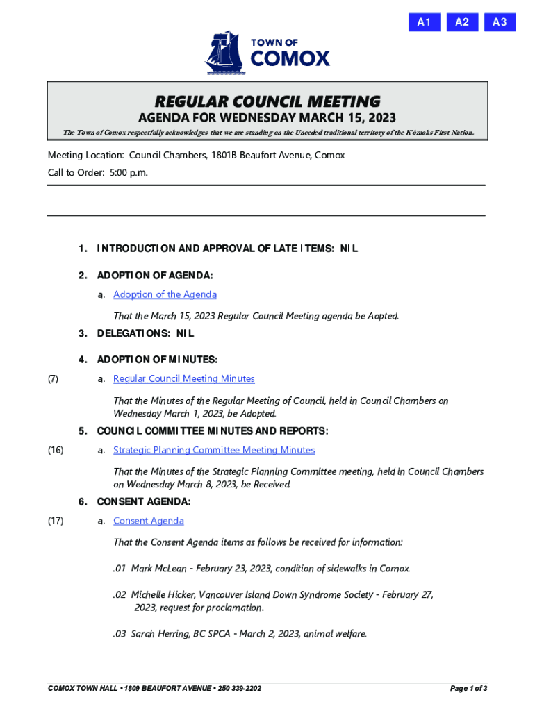 A1A2REGULAR COUNCIL MEETINGAGENDA FOR WEDNESDAY, MARCH 15, 2023, The Town of Como respectfully acknowledges that we are standing on the Needed traditional territory of the Kooks First Nation. Meeting