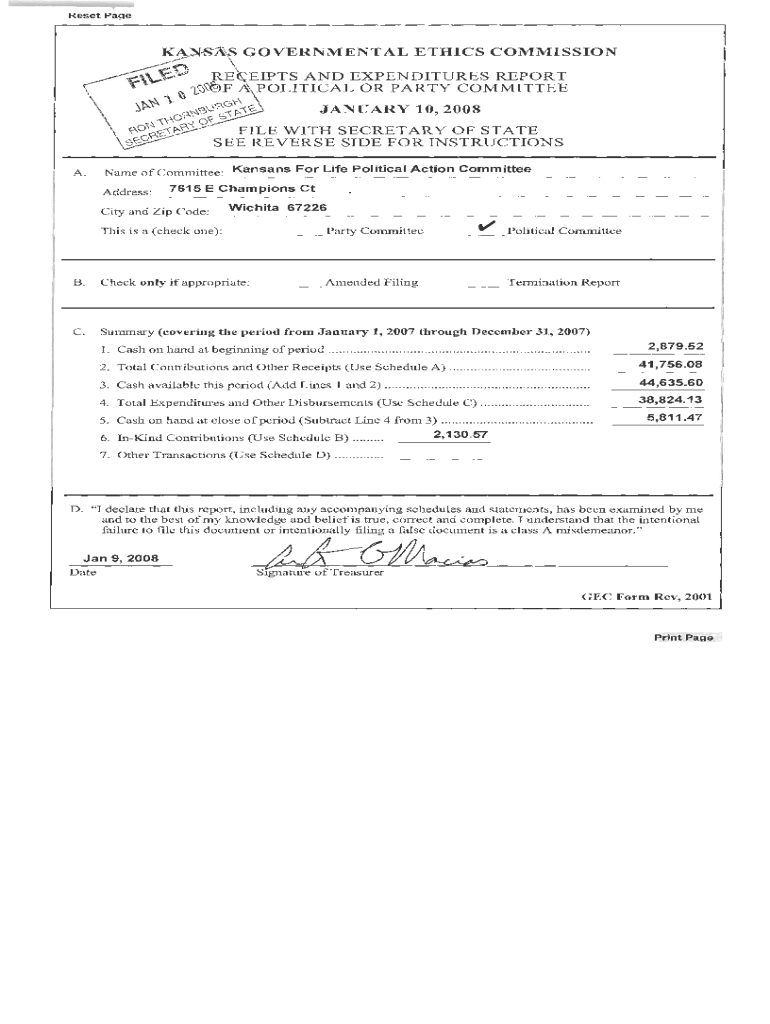Reset Arkansas GOVERNMENTAL ETHICS COMMISSION. Name of Committee: Kansans For Life Political Action Committee Address:II.7615 E Champions City and Zip Code:Wichita 67226This is a (check one):Party