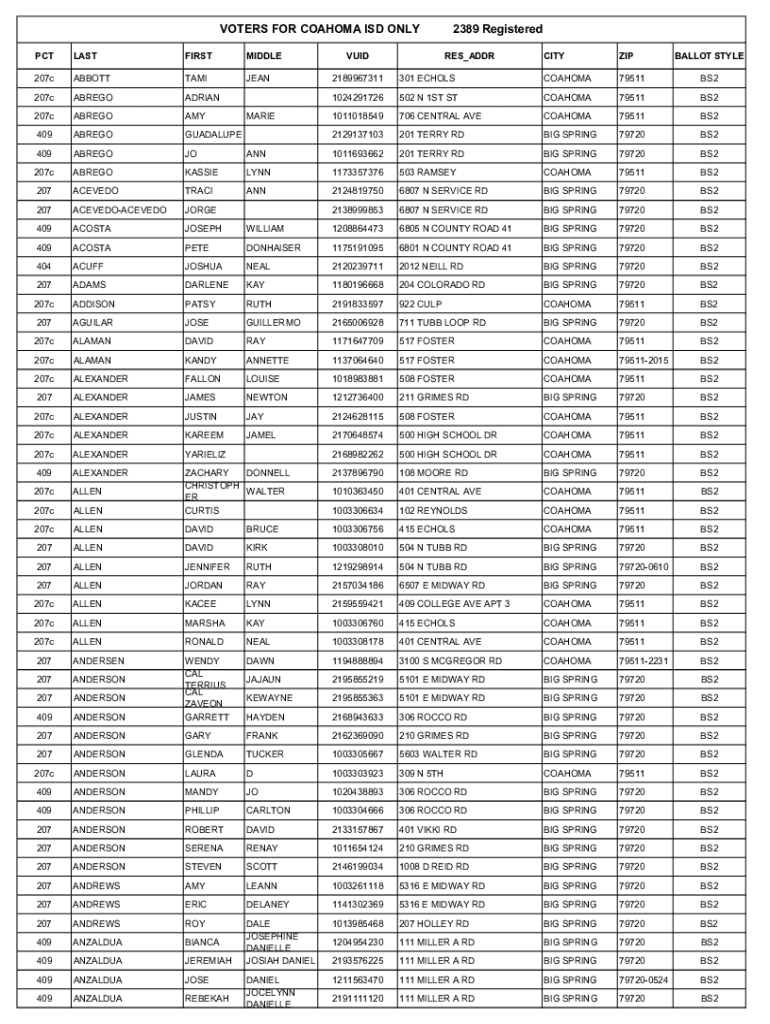 VOTERS FOR COLOMA ISD ONLY PCTLASTFIRSTMIDDLE207cABBOTTTAMIJEAN207cABREGOADRIAN207cABREGOAMY409ABREGOGUADALUPEMARIEVUID2389 Registered RES_ADDRCITYZIPBALLOT STYLE2189967311301 ECHOLSCOAHOMA79511BS21024291726502