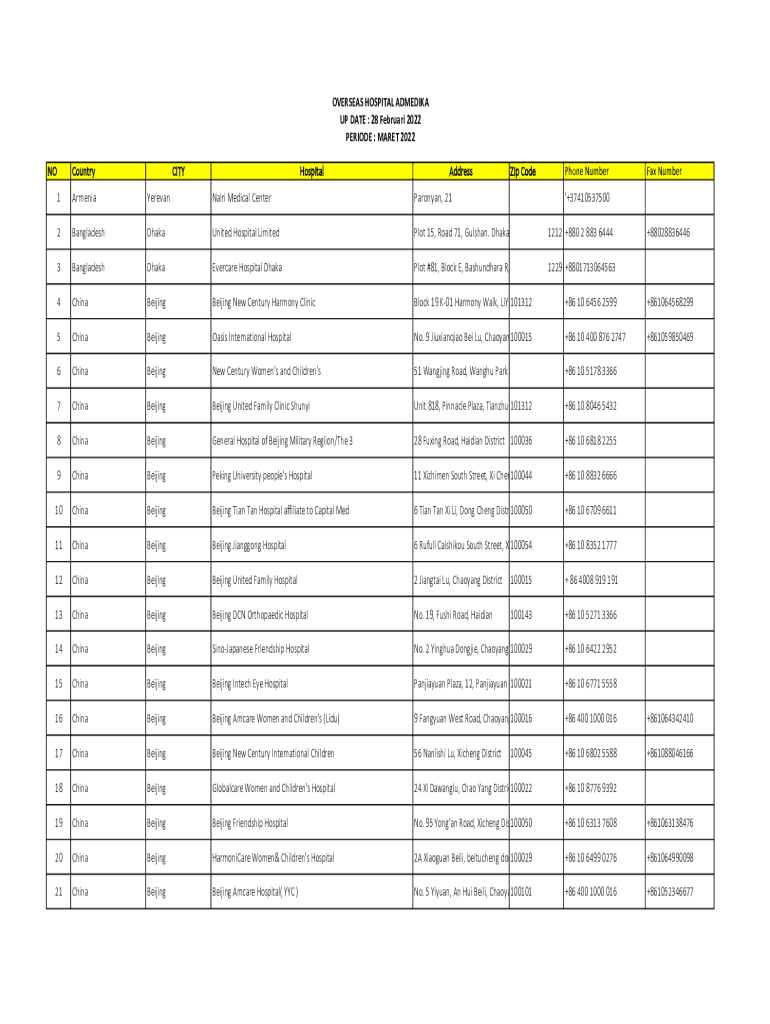 NOCountryCITYHospitalAddressZip Telephone Number Number1ArmeniaYerevanNairi Medical CenterParonyan, 21\'+374105375002BangladeshDhakaUnited