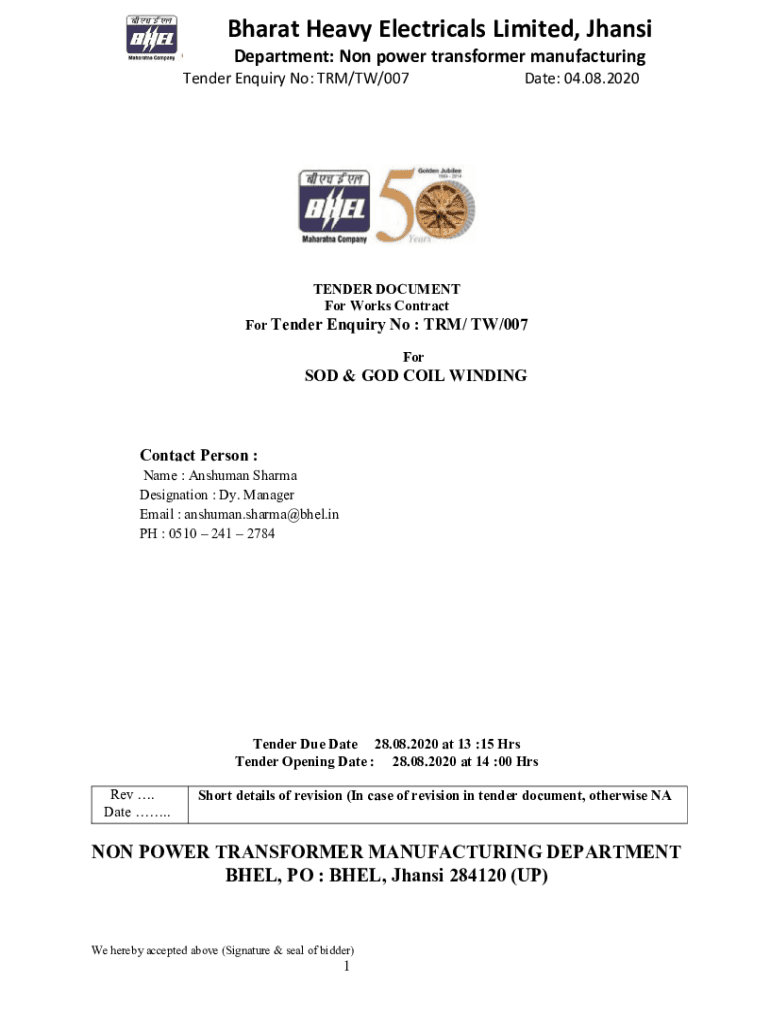Bharat Heavy Electrical Limited, Jhansi Department: Non-power transformer manufacturing Tender Inquiry No: TRM/TW/007Date: 04.08.2020TENDER DOCUMENT For Works Contract For Tender Inquiry No : TRM/