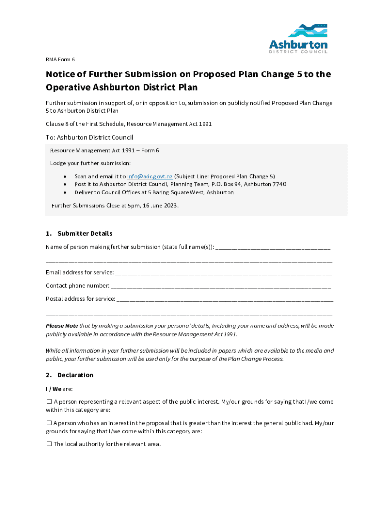 RMA Form 6Notice of Further Submission on Proposed Plan Change 5 to the Operative Ashburn District Plan Further submission in support of, or in opposition to, submission on publicly notified Proposed