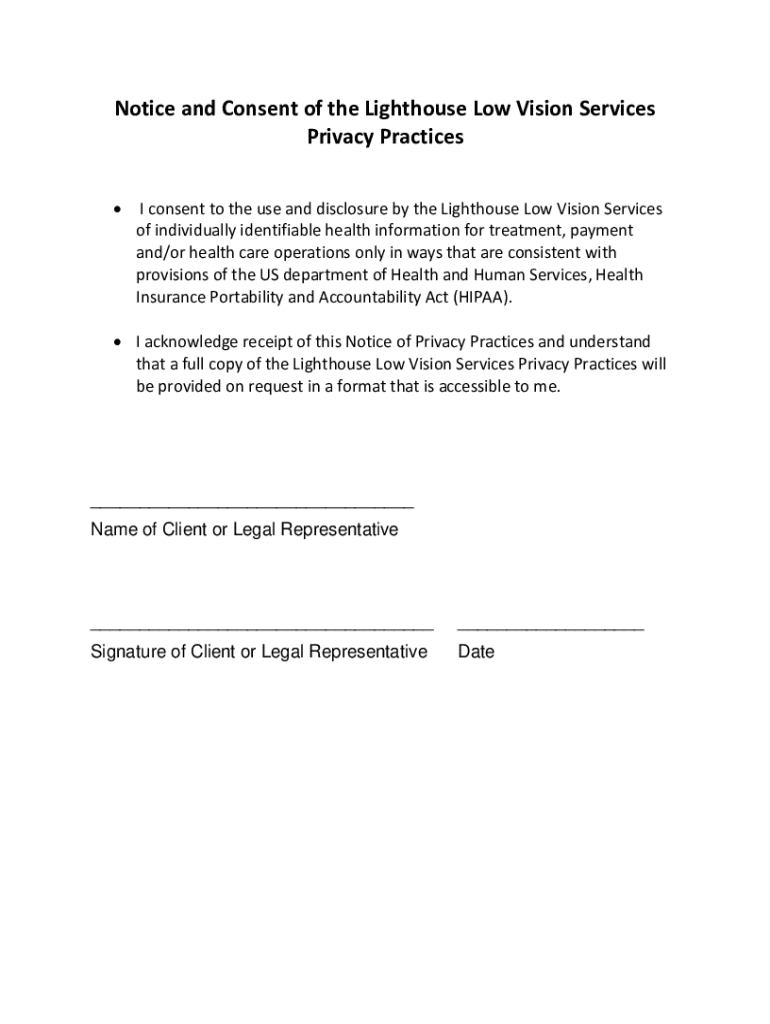 Get the free Notice and Consent of the Lighthouse Low Vision Services ...