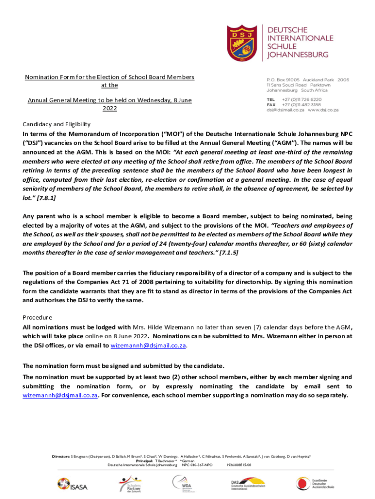 Nomination Form for the Election of School Board Members at the Annual General Meeting to be held on Wednesday, 8 June 2022 Candidacy and Eligibility In terms of the Memorandum of Incorporation (MOI)