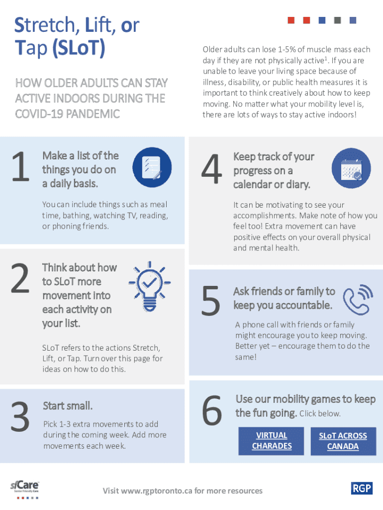 Stretch, Lift, or Tap (Slot) HOW OLDER ADULTS CAN STAY ACTIVE INDOORS DURING THE COVID-19 PANDEMIC1Make a list of the things you do on a daily basis. Older adults can lose 15% of muscle mass each