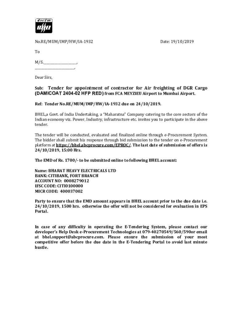 No.RE/MUM/IMP/HW/IA1932Date: 19/10/2019To M/S.___, ___, Dear Sirs, Sub:Tender for appointment of contractor for Air freighting of DR Cargo (DEMOCRAT 240402 HIP RED) from FCA MENZIES Airport to Mumbai
