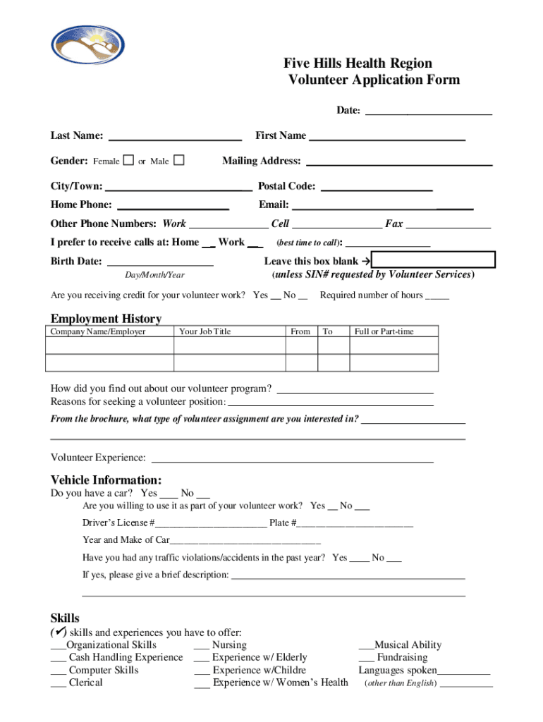 Five Hills Health Region Volunteer Application Form Date: ___ Last Name: Gender: FemaleFirst Name Mailing Address: ___or Salacity/Town:___Home Phone: ___Postal Code: ___ Email:___Other Phone Numbers: