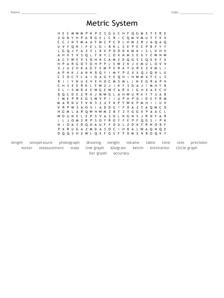 Name: ___Date: ___Metric System H Z C U L A A H × A C B C S B I M V H W I N P DE O C V G H C P J P S I H L Q M A R G O L I K QC B J Y Q V T A U N O I S I C E R P M U J O R QM Y N Q J T W R Z K C