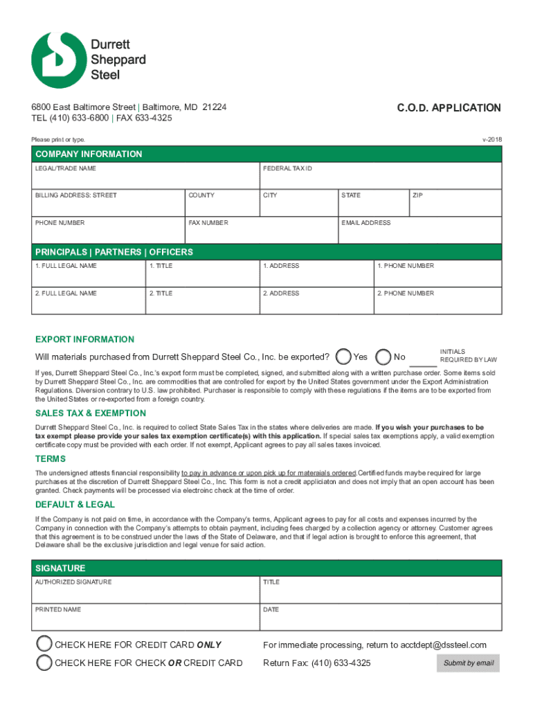 C.O.D. APPLICATION6800 East Baltimore Street | Baltimore, MD 21224 TEL (410) 6336800 | FAX 6334325 Please print or type.v2018COMPANY INFORMATION LEGAL/TRADE NAMEFEDERAL TAX BILLING ADDRESS: STREETCOUNTYPHONE