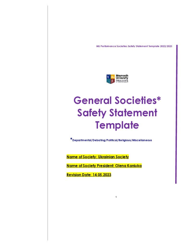 General Societies* Safety Statement Template *Departmental/Debating/Political/Religious/Miscellaneousness of Society: Ukrainian Society Name of Society President: Elena Hanuka Revision Date: 14.05.2023!1MU