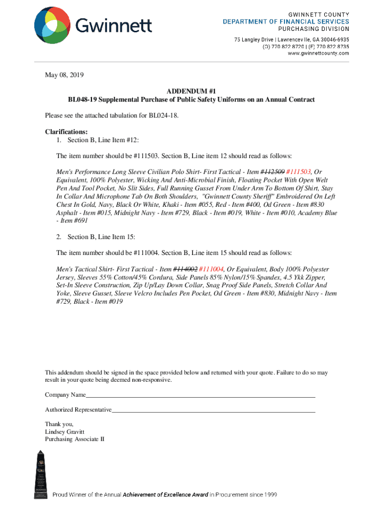 May 08, 2019, ADDENDUM #1 BL04819 Supplemental Purchase of Public Safety Uniforms on an Annual Contract Please see the attached tabulation for BL02418. Clarifications: 1. Section B, Line Item #12: