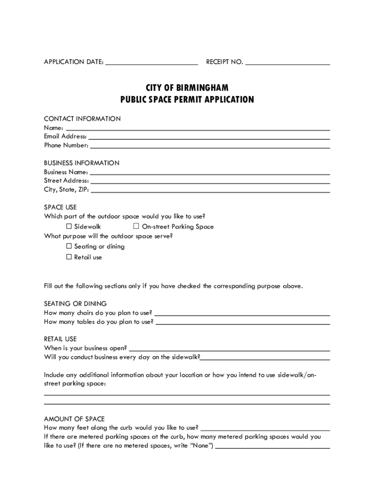 APPLICATION DATE:RECEIPT NO.CITY OF BIRMINGHAM PUBLIC SPACE PERMIT APPLICATION CONTACT INFORMATION Name: Email Address: Phone Number: BUSINESS INFORMATION Business Name: Street Address: City, State,