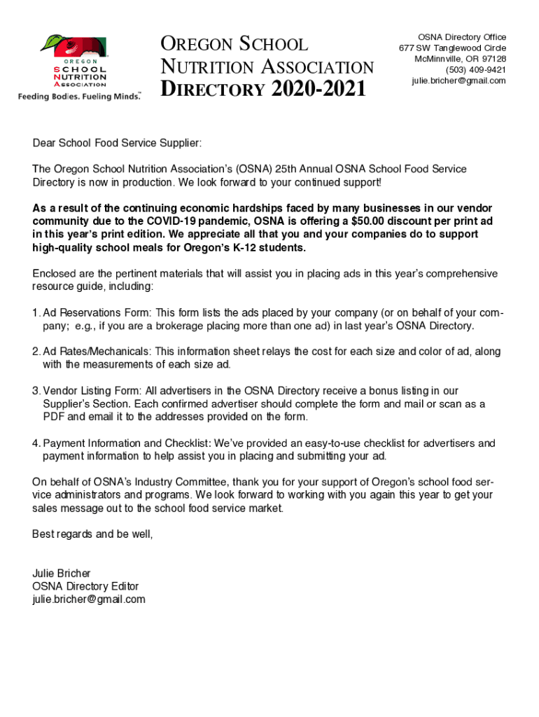 Oregon School Nutrition Association Directory 20202021OSNA Directory Office 677 SW Tangle wood Circle McMinnville, OR 97128 (503) 4099421 julie.bricher@gmail.comDear School Food Service Supplier: