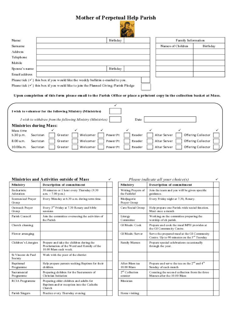 Mother of Perpetual Help Parsonage:BirthdayFamily InformationSurnameNames of ChildrenBirthdayAddress Telephone Mobile Spouses nameBirthdayEmail address Please tick (this box if you would like the
