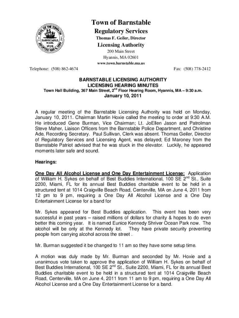 Town of Barnstable Regulatory Services Thomas F. Gale, DirectorLicensing Authority 200 Main Street Hannes, MA 02601 www.town.barnstable.ma.usTelephone: (508) 8624674Fax: (508) 7782412BARNSTABLE LICENSING
