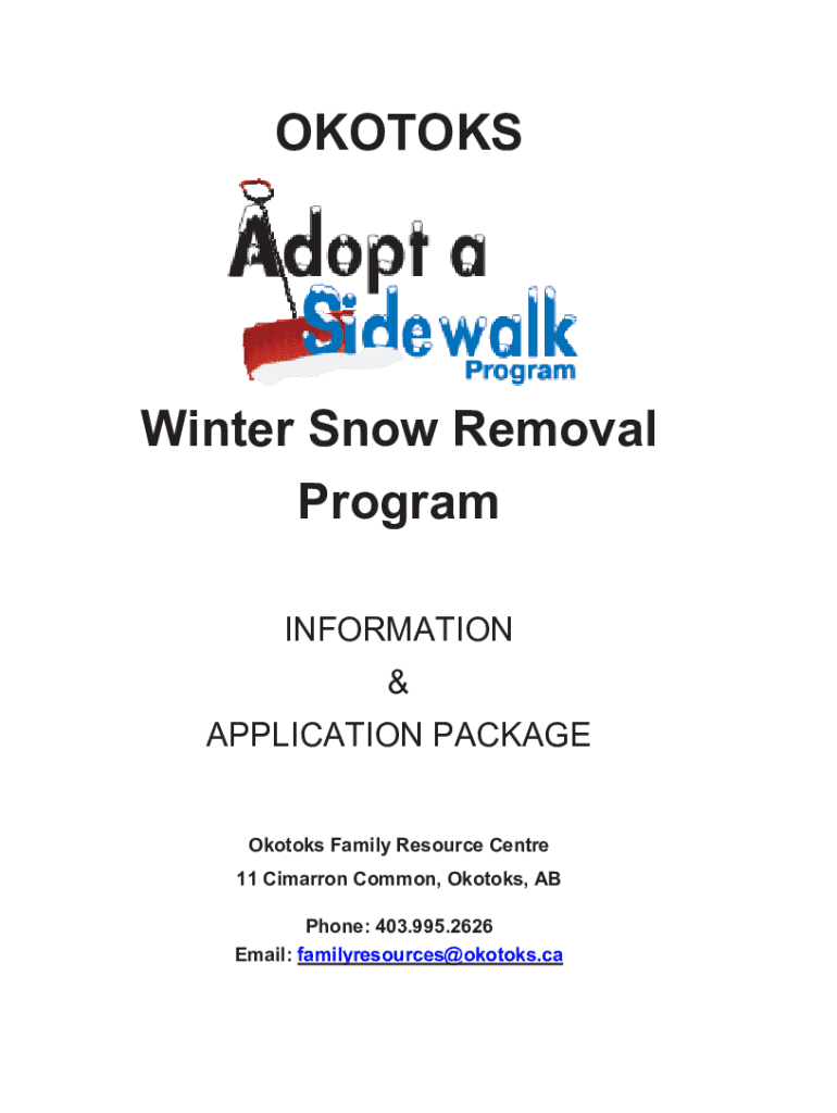 OKOTOKSWinter Snow Removal Program INFORMATION & APPLICATION PACKAGE Kooks Family Resource Center 11 Cimarron Common, Kooks, AB Phone: 403.995.2626 Email: familyresources@okotoks.caProgram Overview