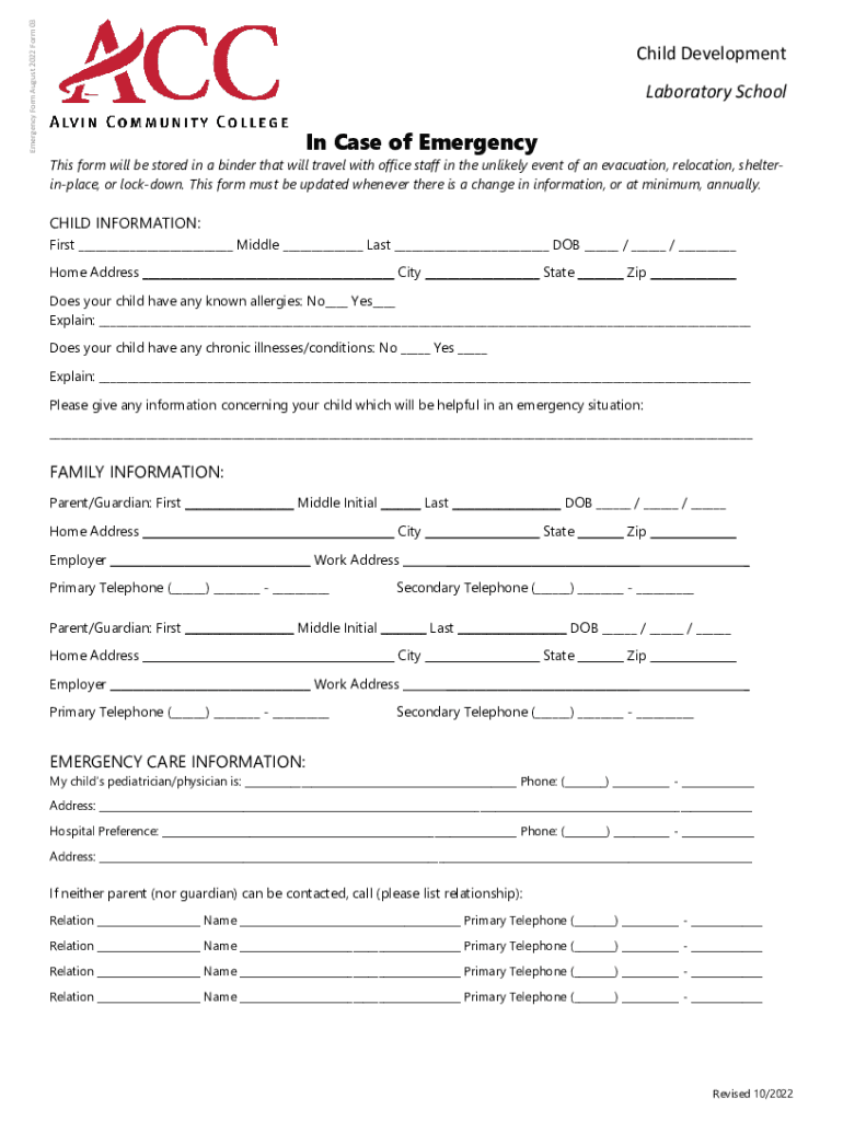 Emergency Form August 2022 Form 03Child Development Laboratory Schooling Case of EmergencyThis form will be stored in a binder that will travel with office staff in the unlikely event of an evacuation,