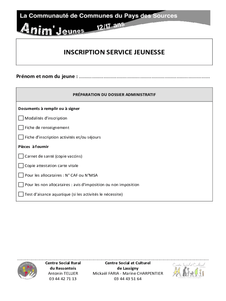 INSCRIPTION SERVICE JEUNESSEPrnom et not Du June : ..........................................................................................