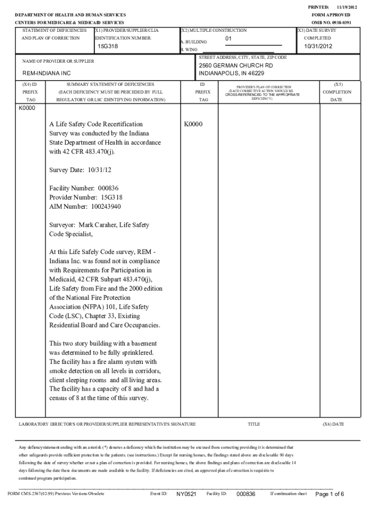 PRINTED: DEPARTMENT OF HEALTH AND HUMAN SERVICES CENTERS FOR MEDICARE & MEDICAID SERVICES STATEMENT OF DEFICIENCIES(X1) PROVIDER/SUPPLIER/LIGAND PLAN OF CORRECTIONIDENTIFICATION NUMBER:15G31811/19/2012FORM