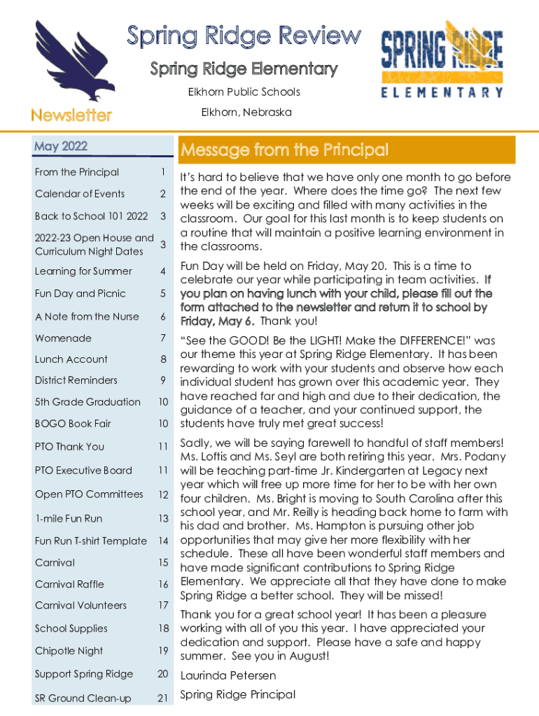 Spring Ridge Review Spring Ridge Elementary Elk horn Public SchoolsNewsletterElkhorn, Nebraska May 2022Message from the PrincipalFrom the Principal1Calendar of Events2Back to School 101 20223202223