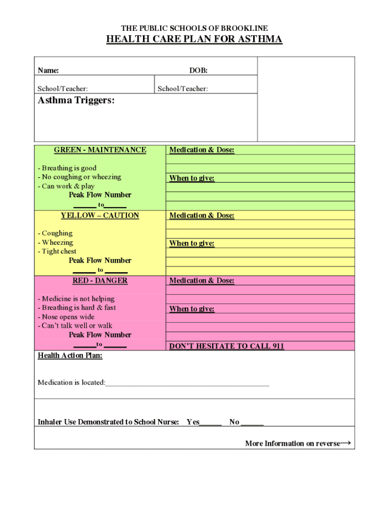 THE PUBLIC SCHOOLS OF BROOKLINEHEALTH CARE PLAN FOR ASTHMA Name: School/Teacher:DOB: School/Teacher:Asthma Triggers:GREEN MAINTENANCE Breathing is good No coughing or wheezing Can work & play Peak