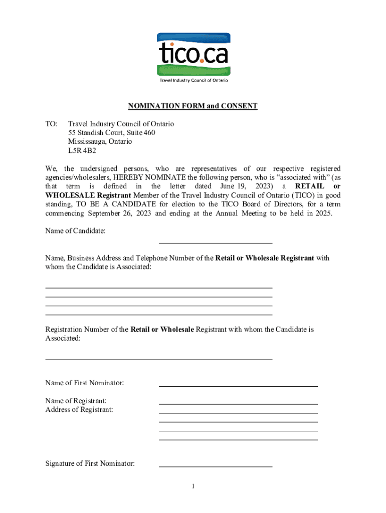 NOMINATION FORM and CONSENT TO:Travel Industry Council of Ontario 55 Standish Court, Suite 460 Mississauga, Ontario L5R 4B2We, the undersigned persons, who are representatives of our respective registered
