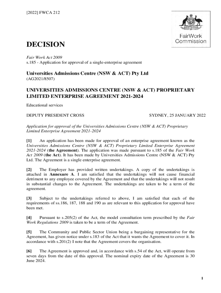 s.185 Application for approval of a single enterprise agreementUniversities Admissions Center (NSW & ACT) Pty Ltd