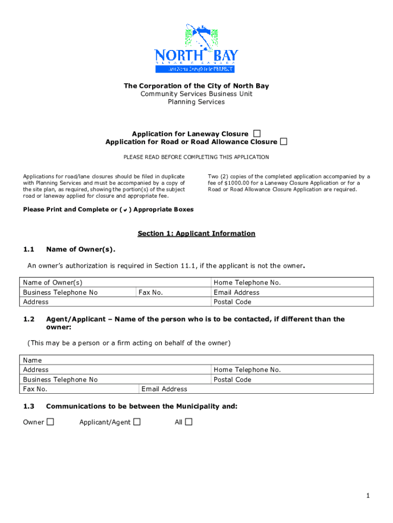 The Corporation of the City of North Bay Community Services Business Unit Planning ServicesApplication for Lane way Closure Application for Road or Road Allowance Closure PLEASE READ BEFORE COMPLETING