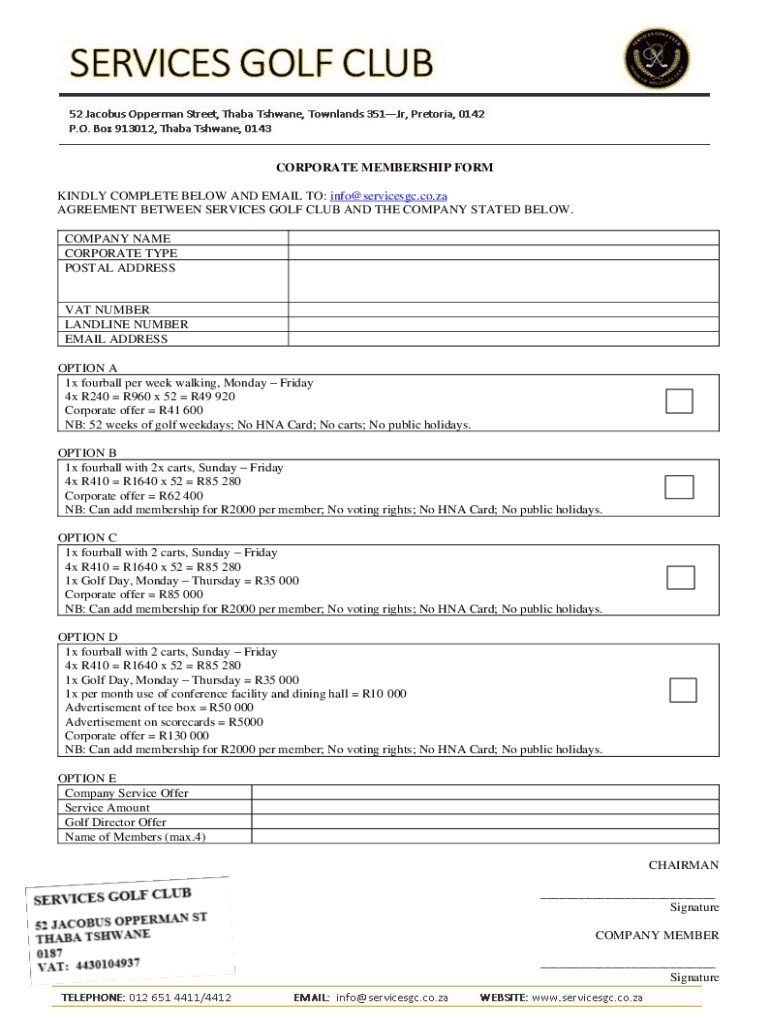 CORPORATE MEMBERSHIP FORM KINDLY COMPLETE BELOW AND EMAIL TO: info@servicesgc.co.za AGREEMENT BETWEEN SERVICES GOLF CLUB AND THE COMPANY STATED BELOW. COMPANY NAME CORPORATE TYPE POSTAL ADDRESS VAT