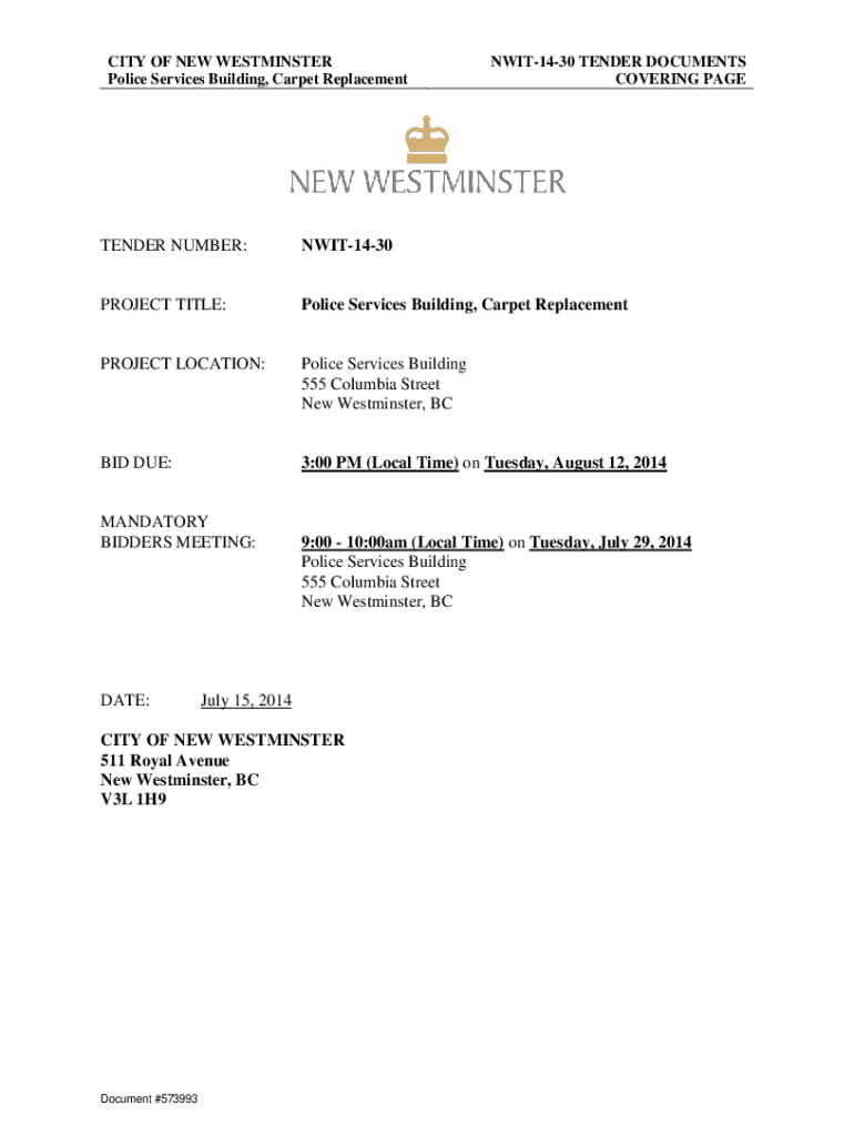 CITY OF NEW WESTMINSTER Police Services Building, Carpet ReplacementNWIT1430 TENDER DOCUMENTS COVERING PRETENDER NUMBER:NWIT1430PROJECT TITLE:Police Services Building, Carpet ReplacementPROJECT LOCATION:Police