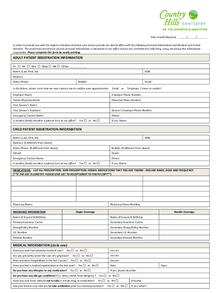 Date month/day/year ___/___/___ In order to provide you with the highest standard of dental care, please provide our dental office with the following Personal Information and Medical and Dental Histories.