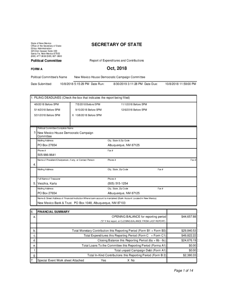 State of New Mexico Office of the Secretary of State Ethics Administration 325 Don Gaspar Suite 300 Santa Fe, New Mexico 87503 (800) 4773632/(505) 8273600SECRETARY OF STATEPolitical CommitteeReport