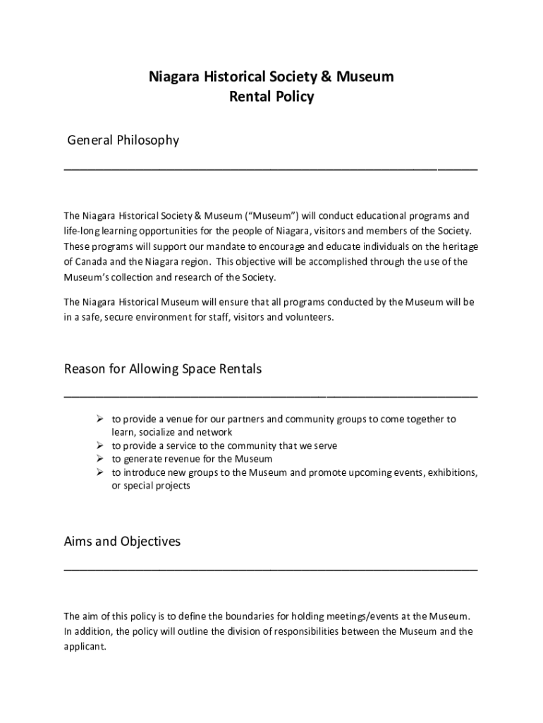 Niagara Historical Society & Museum Rental Policy General Philosophy___ The Niagara Historical Society & Museum (Museum) will conduct educational programs and lifelong learning opportunities for the