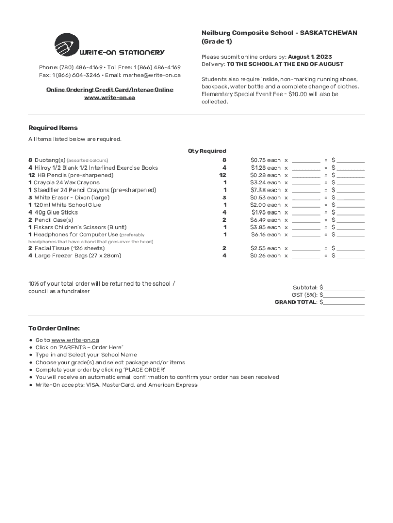 Neil burg Composite School SASKATCHEWAN (Grade 1)Phone: (780) 4864169 Toll Free: 1 (866) 4864169 Fax: 1 (866) 6043246 Email: marhea@writeon.ca Online Ordering! Credit Card/Interact Online www.writeon.caPlease