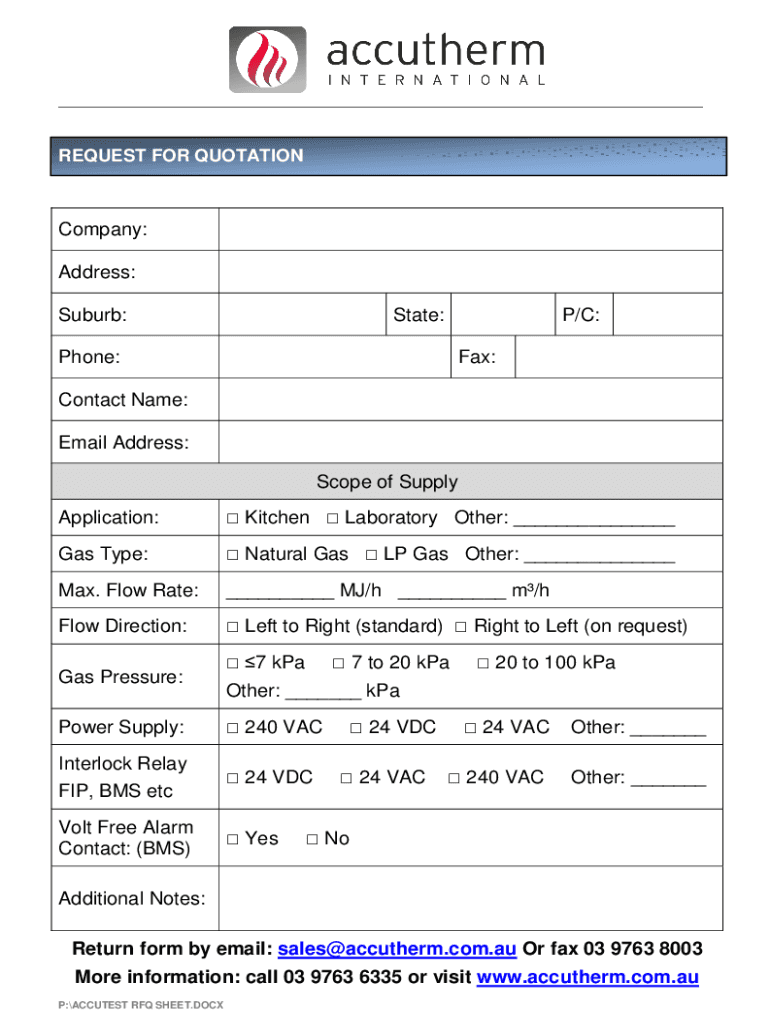 ___REQUEST FOR QUOTATIONCompany: Address: Suburb:State:P/C:Phone:Fax:Contact Name: Email Address: Scope of Supply Application: Kitchen Laboratory Other: ___Gas Type: Natural Gas LP Gas Other: ___Max.