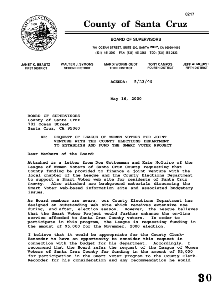 0217County of Santa Cruz BOARD OF SUPERVISORS 701 OCEAN STREET, SUITE 500, SANTA CRUZ, CA 950604069(831) 4542200FAX: (831) 4543262TDD: (831) 4542123JANET K. BEAUTZWALTER J. SYMONSMARDI WORMHOUDTTONY