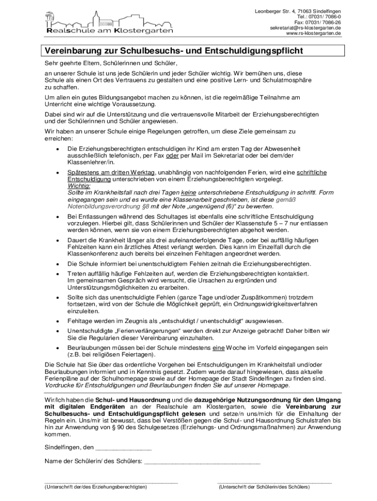 www.rsklostergarten.deVereinbarung our Schulbesuchs UND Entschuldigungspflicht