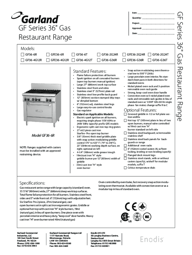 Quantity: ___ Project: ___GF Series 36\” Gas Restaurant RangeApproval: ___ Date: ___Models: GF366R GFE366R GF366T GF364G12R GFE364G12R GF364G12T GF362G24R GFE362G24R GF362G24T GF36G36R GFE36G36RStandard