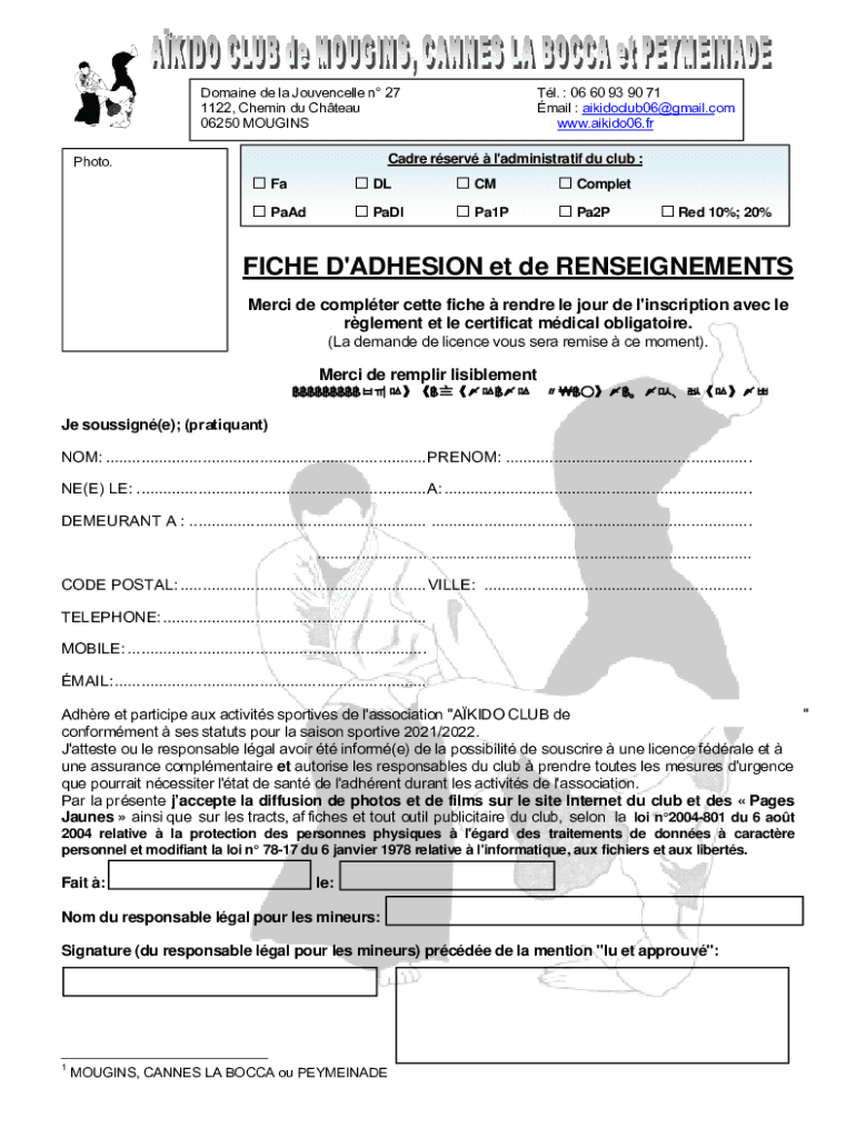 Domain de la Jouvencelle n 27 1122, Che min Du Château 06250 COUSINS Photo. Tl. 06 60 93 90 71 mail : aikidoclub06@gmail.com www.aikido06.frCadre serve l\'administration Du club : Fa Paid DL Paul