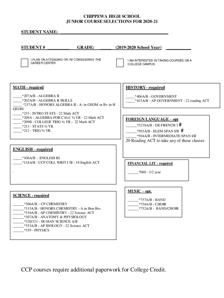 CHIPPEWA HIGH SCHOOL JUNIOR COURSE SELECTIONS FOR 202021 STUDENT NAME: ___STUDENT # ___GRADE:___I PLAN ON ATTENDING OR IM CONSIDERING THE CAREER CENTER(20192020 School Year)___I AM INTERESTED IN TAKING